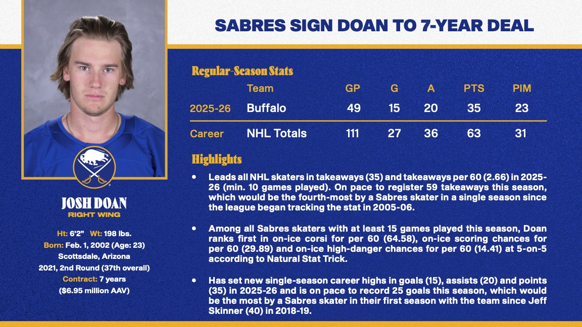 The Buffalo Sabres on Wednesday announced the team signed forward Josh Doan to a seven-year extension with an average annual value of $6.95 million.