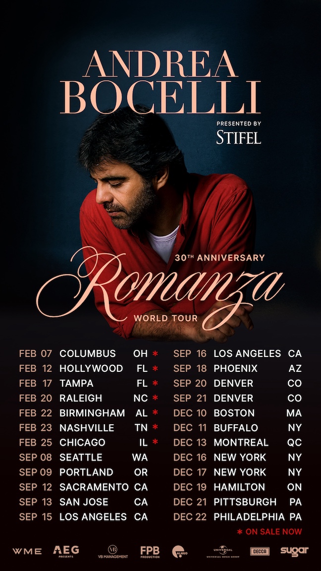 Today, the iconic Italian legend and one of the most beloved and recognized musical voices in the world, maestro Andrea Bocelli, announced new dates for his 2026 “Romanza 30th Anniversary World Tour,” celebrating his widely acclaimed 1997 breakthrough album “Romanza.” The tour will feature many of his famed songs live, including timeless songs like “Con Te Partirò.”