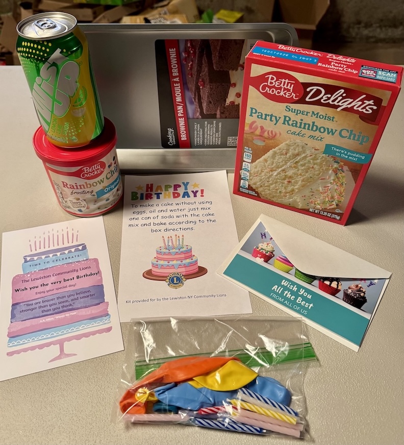 The Lewiston Lions decided to take action by launching a “Cakes for Kids” fundraiser. Each birthday kit includes a cake mix, icing, a can of soda (which replaces the need for oil and eggs), a baking pan, candles, balloons and a birthday card from the Lewiston Lions – along with a separate card for a parent or guardian to give to their child. To date, the club has assembled 120 kits. Of those, 60 have been delivered to the Care and Share Food Pantry in Ransomville and the Lighthouse Women and Children’s Shelter in Niagara Falls, helping ensure more children can enjoy a special birthday celebration.