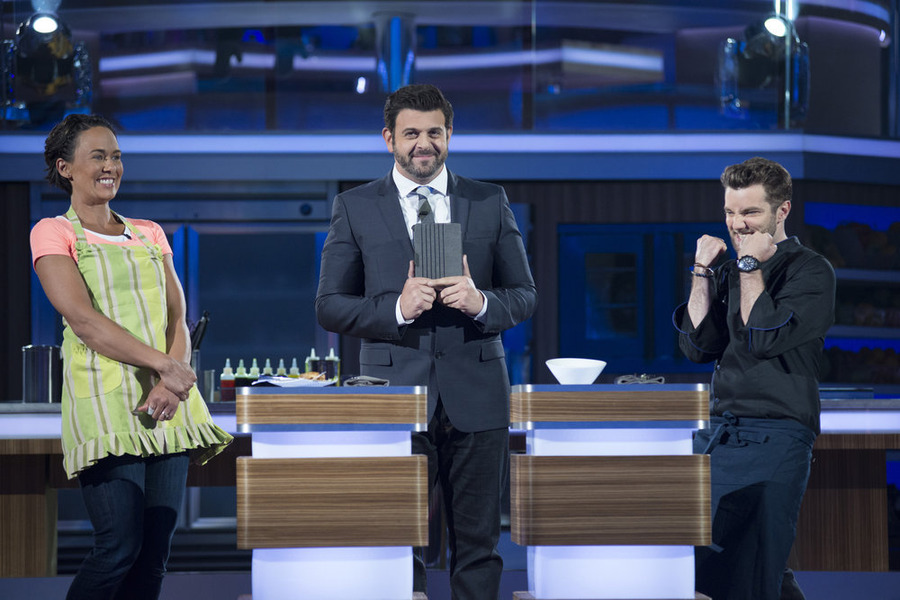 "Food Fighters": Pictured, from left, is home cook Elisha Richman with host Adam Richman and professional chef Marcel Vigneron. (NBC photo by Eddy Chen)