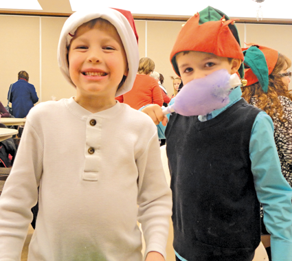 Xavier Severance, left, and Zach Stoddard, who colored holiday ornaments to hand out to guests.