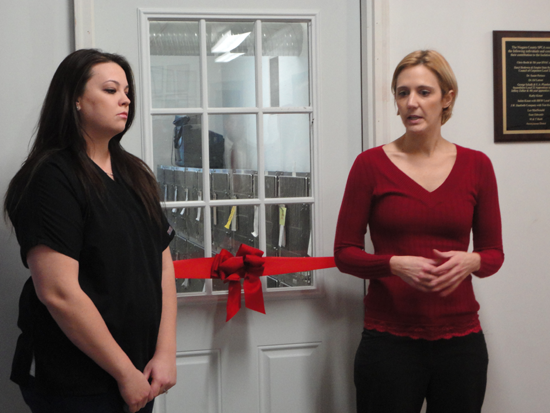 Vet tech Brittany Harrer (left) and SPCA Executive Director Amy Lewis prepare to cut the ribbon on the new isolation room.