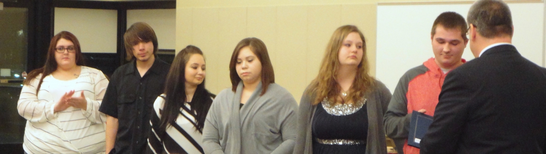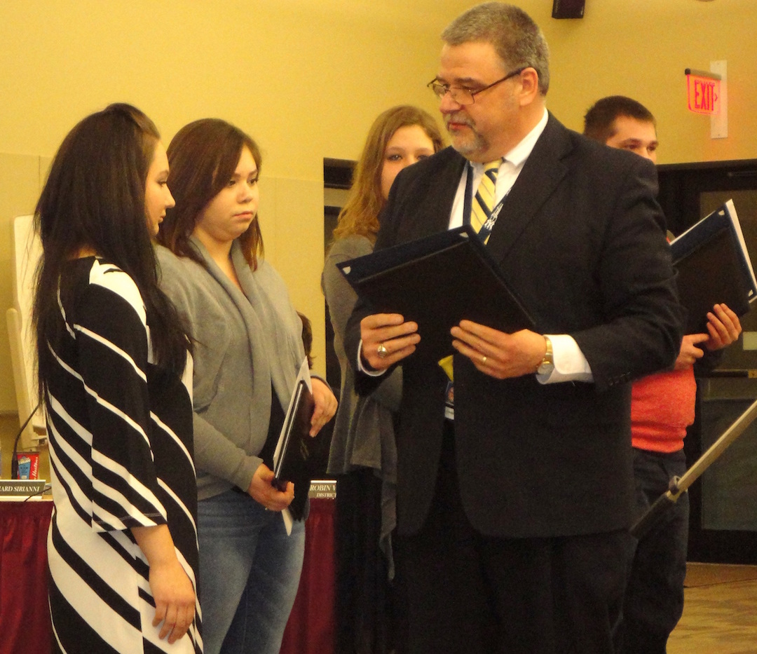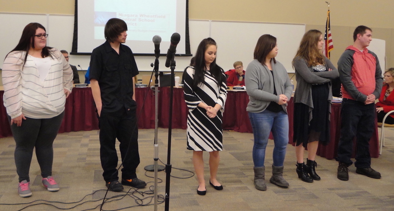 •Early high school graduates were recognized and given Niagara-Wheatfield High School and New York State Regents diplomas in a ceremony at the start of the meeting. Students included Cheyenne Banks, Alexander Deyo (who also received a certificate of completion for the auto-mechanics program at Orleans/Niagara BOCES), Kristin Francis, Lisa Henry, Alexis MacKenzie (who also received a certificate of completion for the early childhood education program at Orleans/Niagara BOCES), Matthew Swanson and Aaron Tirado.