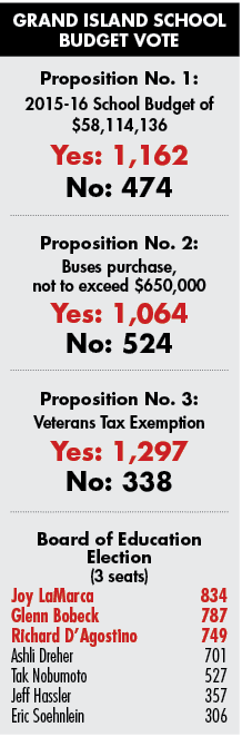 Proposition 1 - The $58,114,136 school budget was passed 1,162 "yes" votes to 474 "no" votes. It calls for a 1.75 percent tax levy increase.