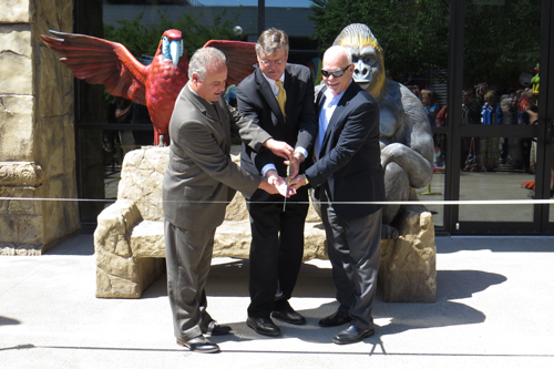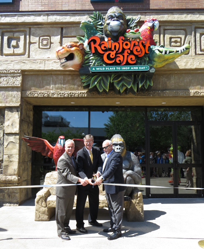 Rainforest Cafe owner Michael DiCienzo, left, is joined at Wednesday's ribbon-cutting ceremony by Niagara Falls Mayor Paul Dyster (center) and Keith Beitler of Landry's, the chain's corporate parent.