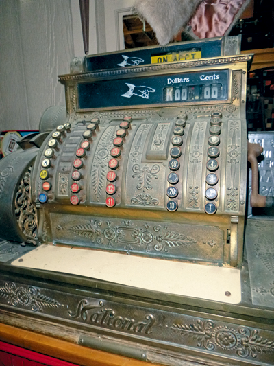 Across the room, the original glass storefront and "Lafler's" sign came from the store run by Bert N. Lafler on North Ridge Road in Cambria. It closed in 1965, and was salvaged by the society.