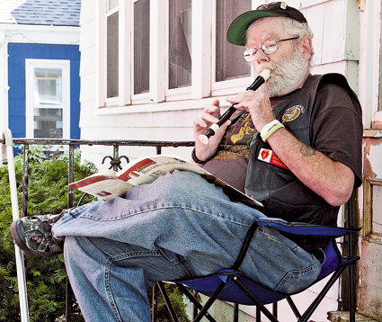 Shown, the volunteers work and O'Connor serenades them with his recorder. (Photos by Karen Gioia.)