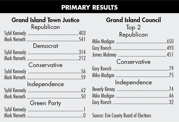 After five head-to-head primaries for town justice, incumbent Sybil Kennedy will hold the Democrat, Independence and Green party lines on the November ballot, while challenger Mark Nemeth will have the Republican and Conservative lines. Mike Madigan and Gary Roesch won the GOP lines in the race for two Town Council seats. Beverly Kinney and Madigan gained the Independence Party lines for council.