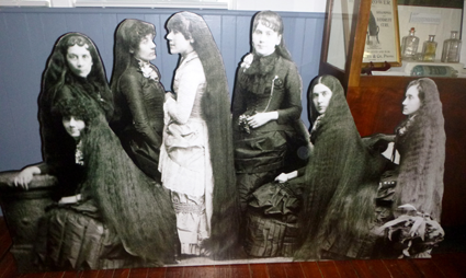 Six of Cambria's most famous residents, the Sutherland sisters, also have their display, including a large cutout of the siblings, hair tonic bottles, photos and a trunk belonging to Isabella Sutherland Castlemaine. Sarah, Victoria, Isabella, Grace, Naomi, Mary and Dora were born in Cambria between 1846 and 1864.