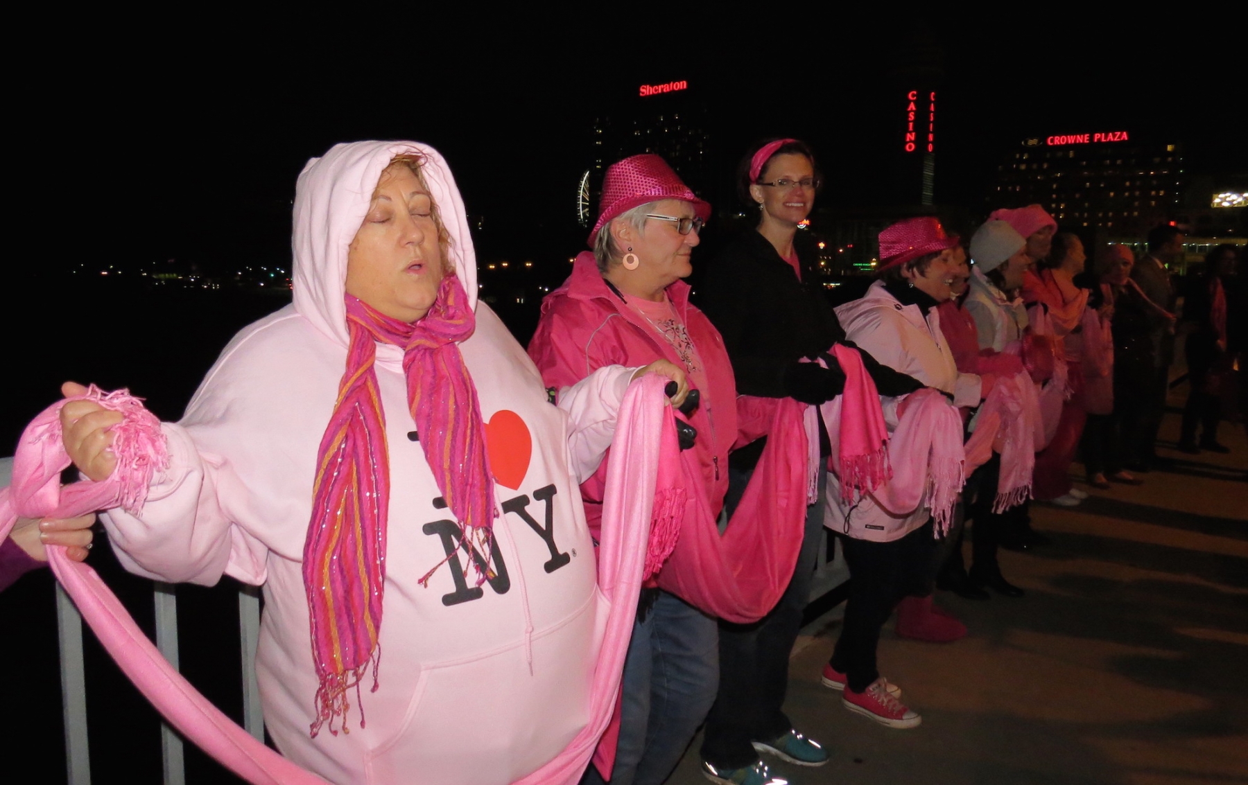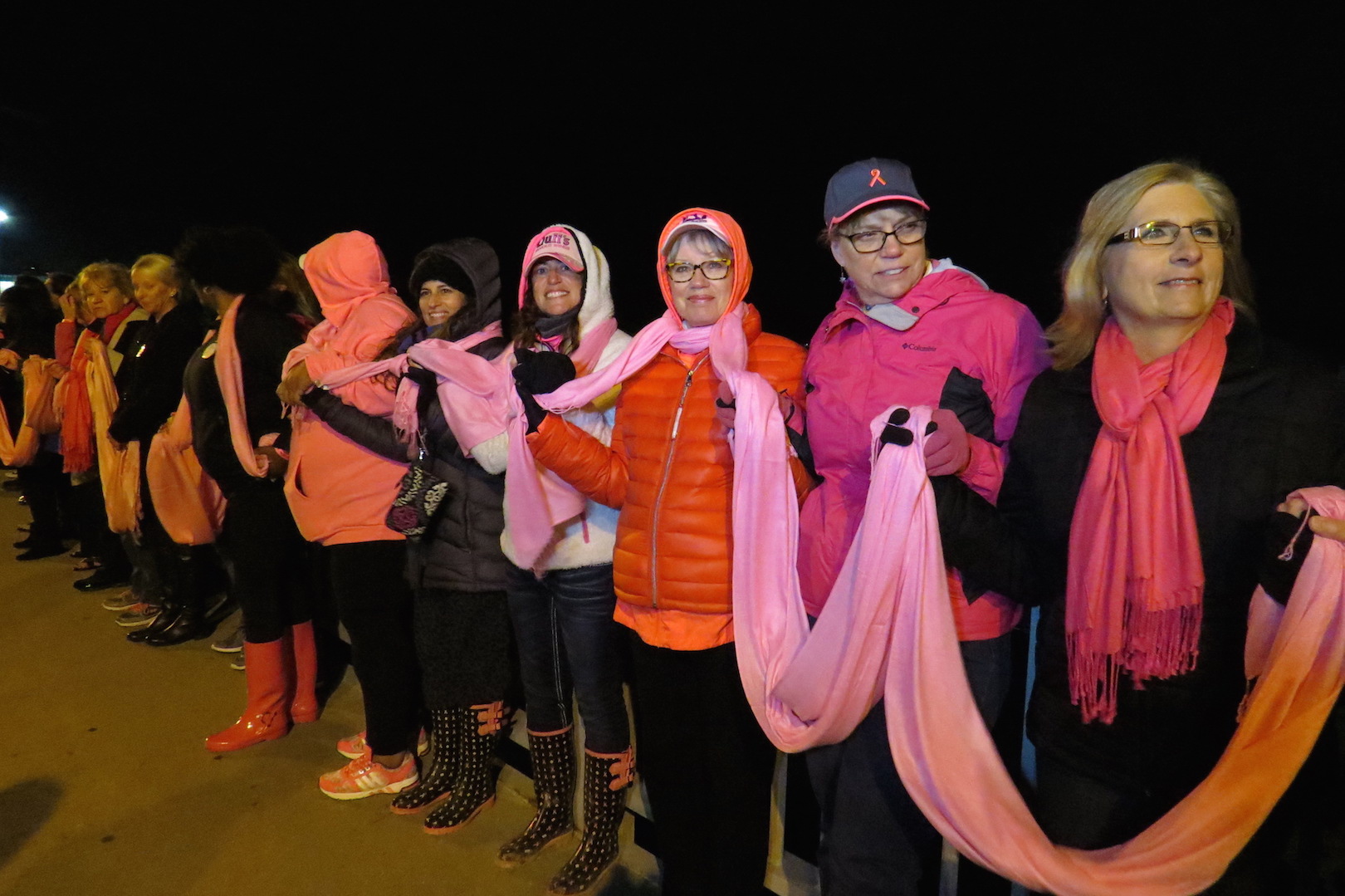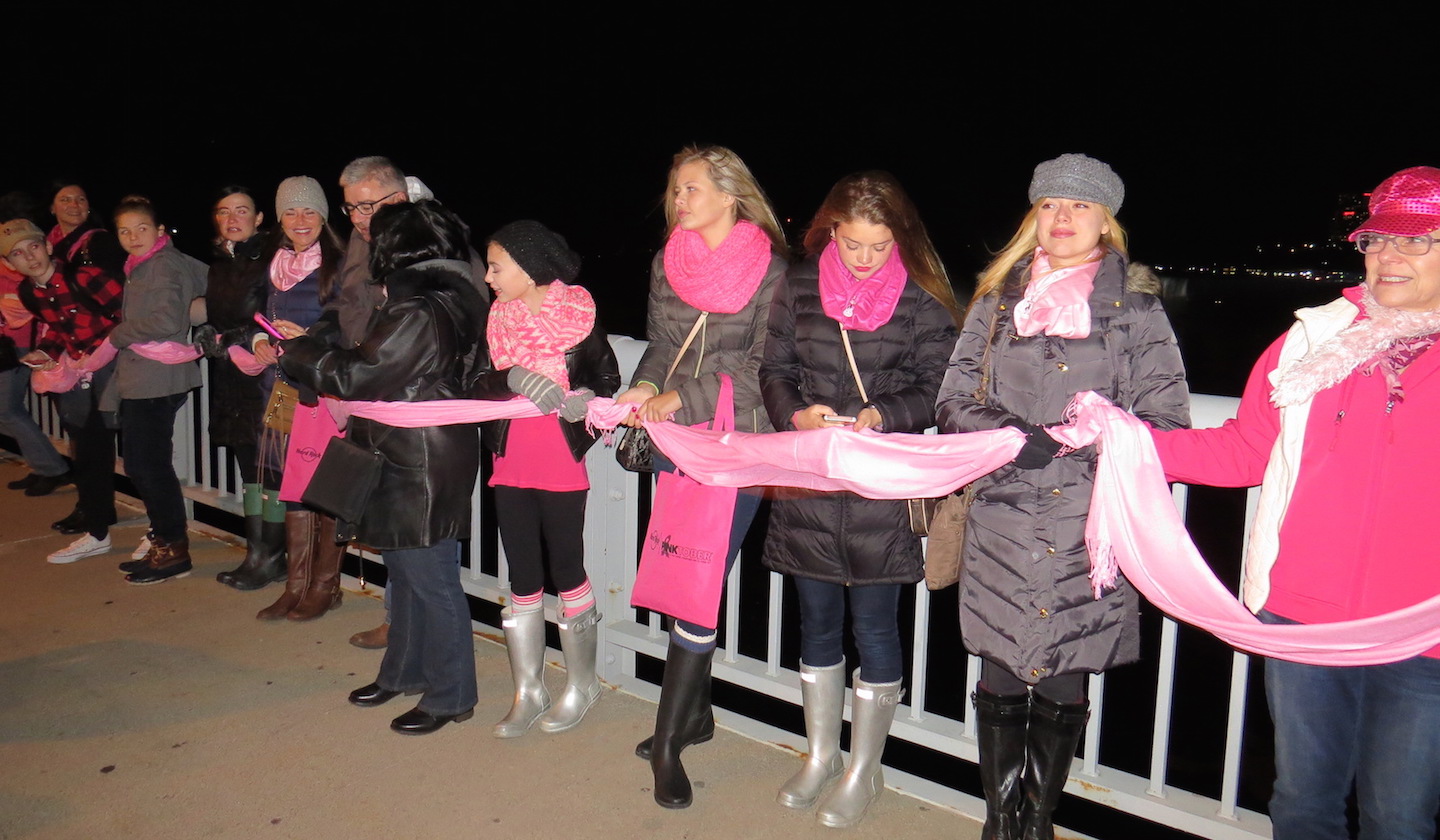 At a quarter to 8 p.m. Friday, about 100 people - mostly women, and many breast cancer survivors - joined together to form a "Living Ribbon" across the Rainbow Bridge in Niagara Falls. Participating in Hard Rock Café Niagara Falls USA's PINKTOBER celebration, these pink pashmina-clad people linked arms in the battle against breast cancer, and to show support for those fighting the loathsome disease.