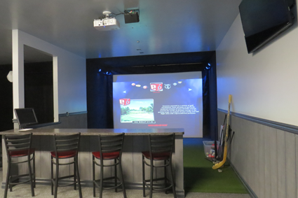 Two large golf simulators await sports and gaming enthusiasts. Each is accompanied by a bar-stooled serving area, which can be used for eating, drinking and mingling.