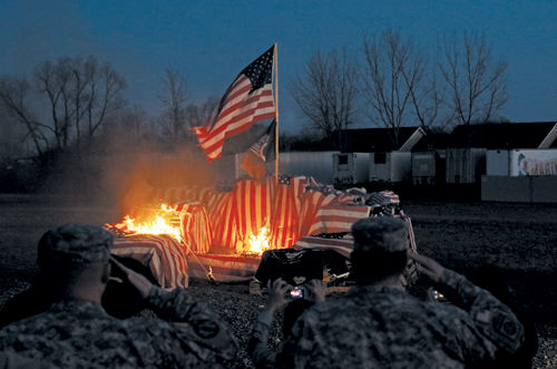 Eagle Scout candidate William Soos and his father, Lt. Col Patrick Soos (ret.) of Grand Island organized the event. The younger Soos said the fire, lit by Grand Island Fire Co. personnel, retired to the flames approximately 500 flags spread out on 80 wood pallets.