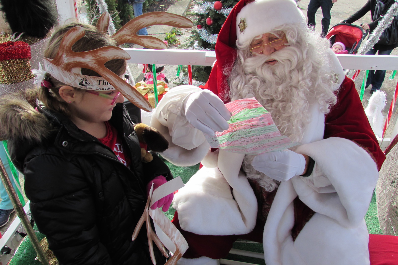 The event kicked off with Santa flying into Academy Park courtesy of a Rainbow Air helicopter. After greeting a couple hundred spectators, he boarded his specially designed Deal Realty float. Then, Santa (and friends) paraded down Center Street to the Lewiston Peace Garden, where he sat and listened as children read their Christmas wish lists to him.