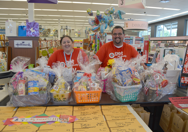 North Tonawanda's Walgreens Assistant Store Manager Michelle Vago stands beside Store Manager Rob Grosskopf with donated gift baskets for the raffle to take place during the store's Customer Appreciation Day. (Photo by Lauren Zaepfel)