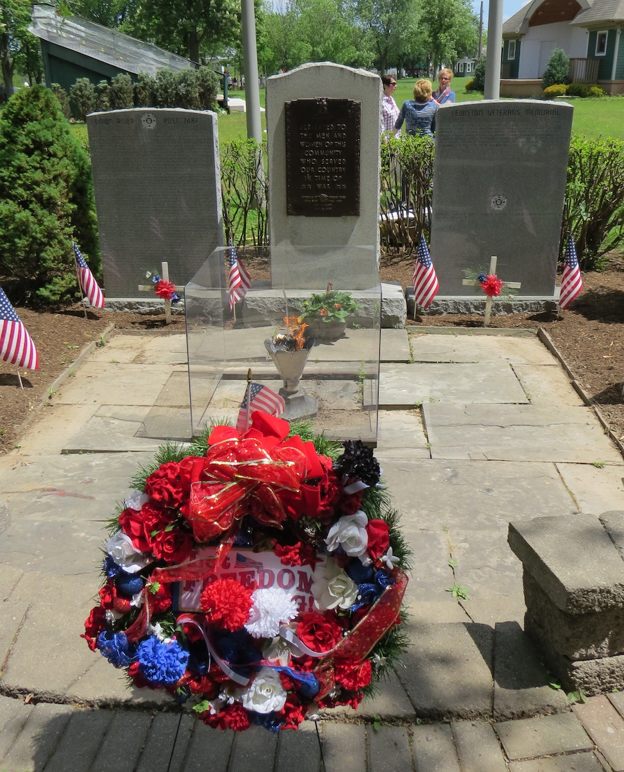 The remembrance service included a C-130 flyover, choral selections from the Lewiston Choraleers, taps by Karl Miller of Bugles Across America, the reading of the honor roll of fallen soldiers, a laying of the memorial wreath, and re-enactors offering a gun volley.