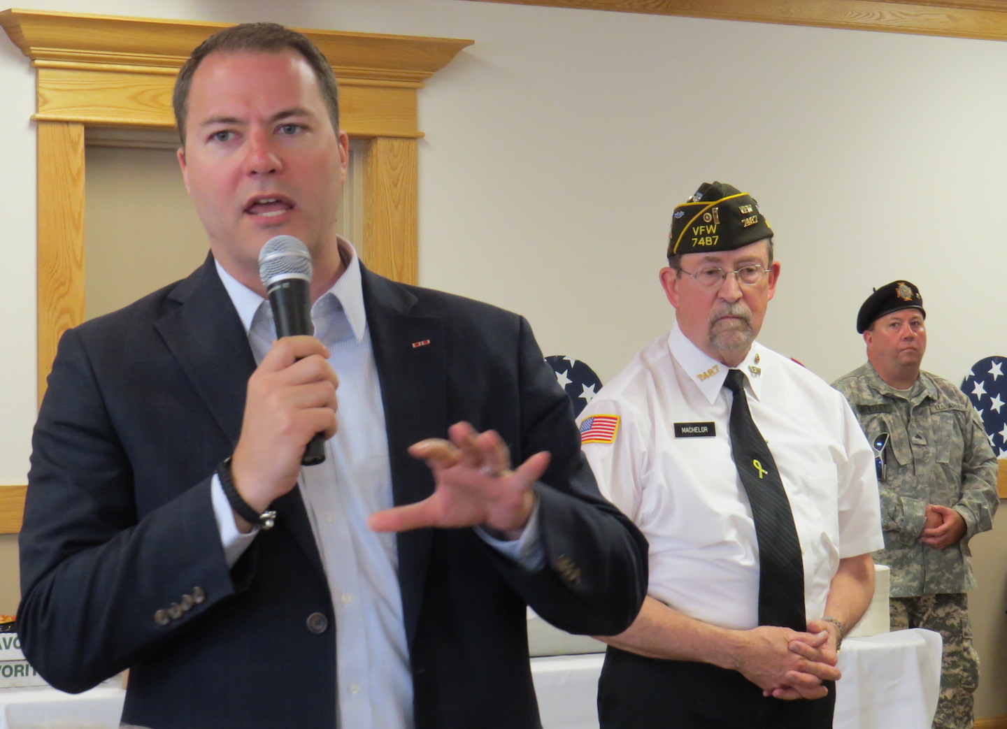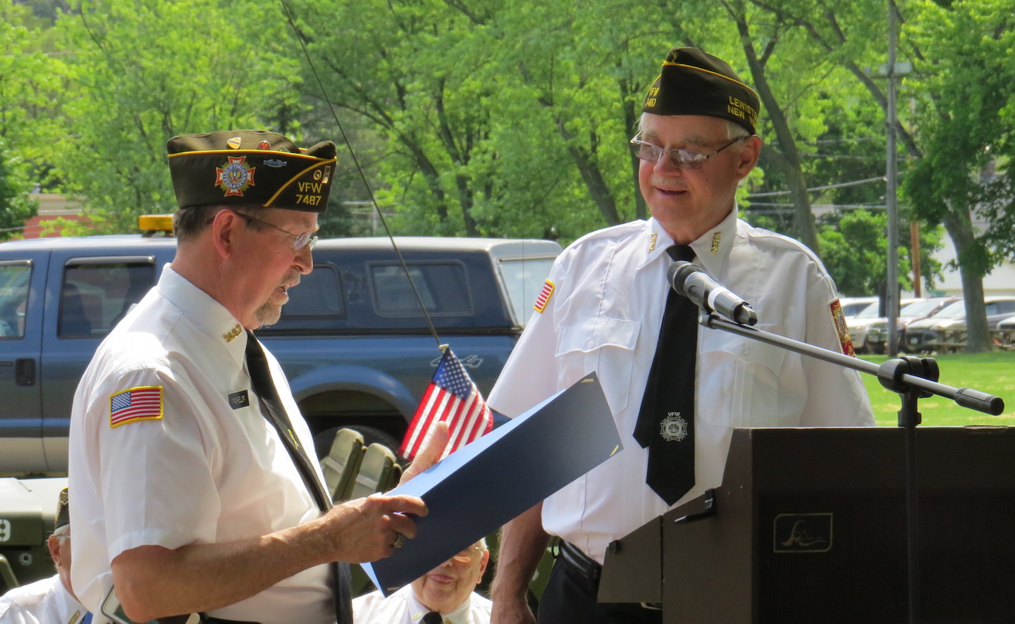 Machelor presents VFW Cmdr. Bill Justyk with a proclamation from Gov. Andrew Cuomo.