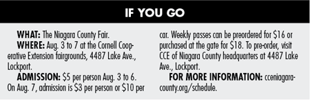 Daily fair passes are $5 per person Wednesday to Saturday and $3 per person or $10 per carload Sunday. Weekly passes can be preordered for $16 or purchased at the gate for $18. To pre-order, visit CCE of Niagara County headquarters at 4487 Lake Ave., Lockport.