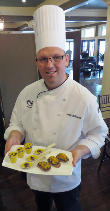 Wegmans (Military Road) event coordinator Jill Feistel and chef Jamie Walkowiak prepare for their time on camera. Below, Walkowiak holds a delicious dish.