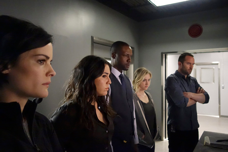 "Blindspot" - "Of Whose Uneasy Route," Episode 121 - Pictured, from left: Jaimie Alexander as Jane Doe, Audrey Esparza as Tasha Zapata, Rob Brown as Edgar Reade, Ashley Johnson as Patterson and Sullivan Stapleton as Kurt Weller. (NBC photo by Paul Sarkis)