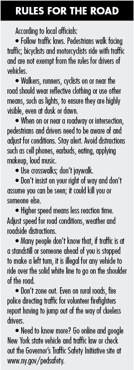 As examples, he noted that people often walk two and three abreast on Fourth Street when entering or leaving an Artpark event, even though sidewalks are available. The annual spring Lewiston-Porter-area 10-mile Garage Sale has had close calls with people intent on bargains not looking when they come out from between parked cars.