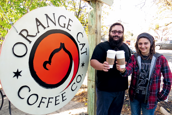 Matthew Garcia and Mary Vaughan salute customers outside of Orange Cat Coffee Co. on Center Street in Lewiston. The popular business is offering 10 percent off all bulk coffee and tea purchases made on Small Business Saturday, Nov. 26. (Photo by Joshua Maloni)