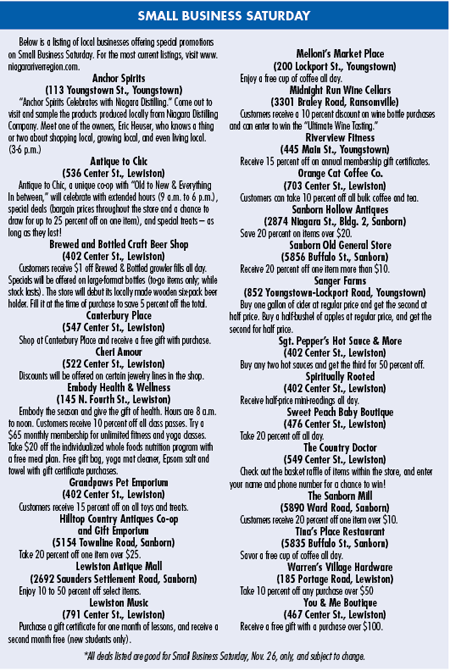 Here are the stores participating in Small Business Saturday. For the most up-to-date listings, visit https://www.niagarariverregion.com/.