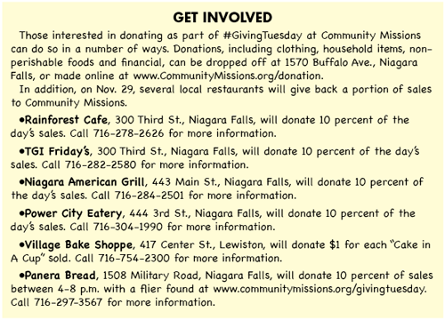 Community Missions of Niagara Frontier has big plans for Giving Tuesday (#GivingTuesday), which is Nov. 29. More than 100 volunteers will visit the agency as part of the event, while many collections throughout the area are also planned.