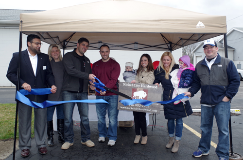 Members of the Grand Island Chamber of Commerce welcomed Nickel City Hardwood into business during a ribbon-cutting and grand opening event Saturday. Pictured, from left: Fahim Mojawalla and Shannon Zaccaria of the chamber; partners Paul Hinderliter and Mike Antonelli of Nickel City Hardwood; Paul's wife Vanessa and son Lucas; Mike's wife Carley and daughter Jocelyn; and Eric Fiebelkorn, president of the chamber. (Photo by Larry Austin)