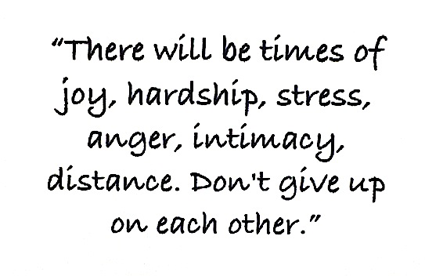 Carolyn Ernst Woomer, happily married to Mark Woomer for 30 years, states "people need to realize that you may go through 'seasons' in a relationship - times of joy, hardship, stress, anger, intimacy, distance. Don't give up on each other. The difficult season will pass, with work, and you can enter a new, better season. Mark and I have been through the highest highs ... and the lowest lows ... but never gave up on 'us.' I feel there are two deal breakers: abuse of any sort or infidelity."