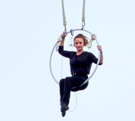 On June 15, the fifth anniversary of Nik Wallenda's tightrope walk across Niagara Falls, his wife, Erendira, broke his iron jaw hang Guinness World Record by dangling 300 feet above the Horseshoe Falls - at times by her teeth.