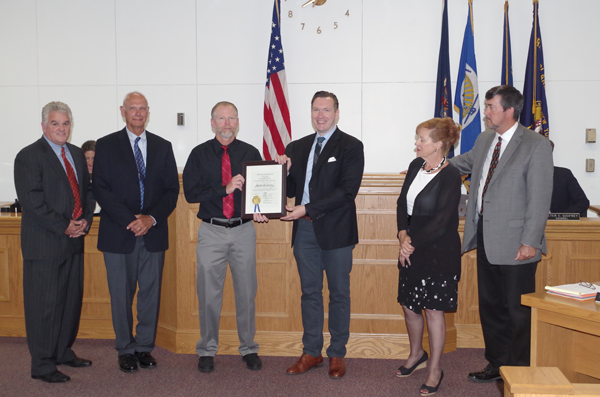 Retiring after 30 years of service to the town, Doug Learman was given a certificate of appreciation at Monday's Grand Island Town Board meeting. Pictured, from left, are councilmen Chris Aronica and Ray Billica, Learman, Town Supervisor Nathan McMurray, and councilmembers Bev Kinney and Mike Madigan. (Photo by Larry Austin)