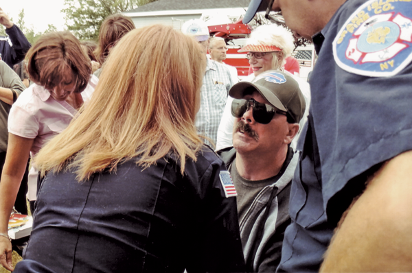 Grand Island Fire Co. personnel Mike DeMartin, Allison DeMartin, Joe Torregrossa, Jon Cinelli, Edie Racz, Nick Egloff and Assistant Fire Chief Omar Sortino listen to Sherry Schupp's emotional thanks to everyone who helped her brother in his critical time of need.