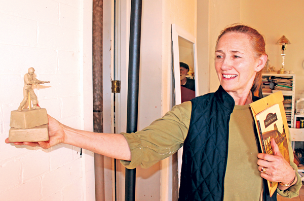 Sculptor Susan Geissler, in her Youngstown studio, shows a "concept model" for the statue she will create of Pfc. Charles N. DeGlopper of Grand Island, a World War II hero who died in the Battle of Normandy saving the lives of his fellow soldiers under fire from German forces. The statue will be installed in DeGlopper Memorial Park at Grand Island Boulevard and Baseline Road.