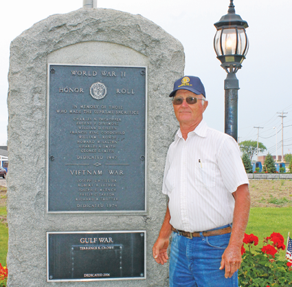 Ray DeGlopper stands in DeGlopper Memorial Park beside the monument that bears the names of Grand Island servicemen who have been killed in action during U.S. wars. At the top of the list of World War II casualties are the names of two of his uncles, Medal of Honor recipient Charles N. DeGlopper, for whom the park is named, and Eugene F. Dinsmore. Fundraising is underway to expand the park and install a statue of Charles DeGlopper that will be sculpted by Susan Geissler of Youngstown.
