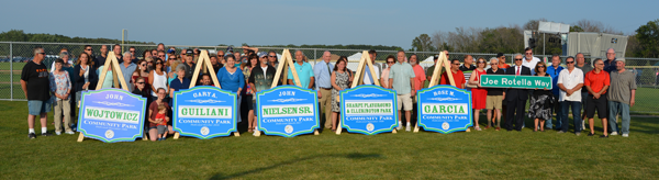 During the ceremony, Town Board members dedicated the road leading into Veterans Memorial Community Park as "Joe Rotella Way." The town's pocket parks were also rededicated to former community members, and new park signs in their honor were unveiled.