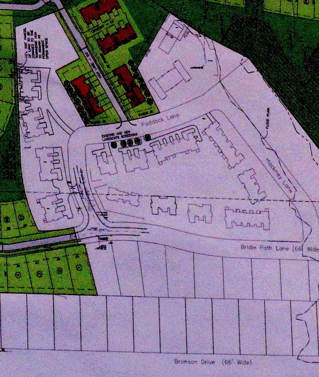 The planned unit development discussed Monday, colored to show contrast. The white rectangles at the bottom are Bronson Drive.