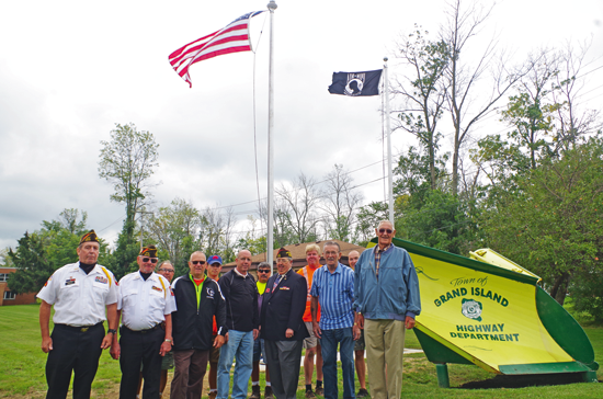 Members of the Town of Grand Island Highway Department, past and present, and members of the Color Guard from the DeGlopper VFW Post raised flags on new poles in front of the highway garage on Whitehaven Road.