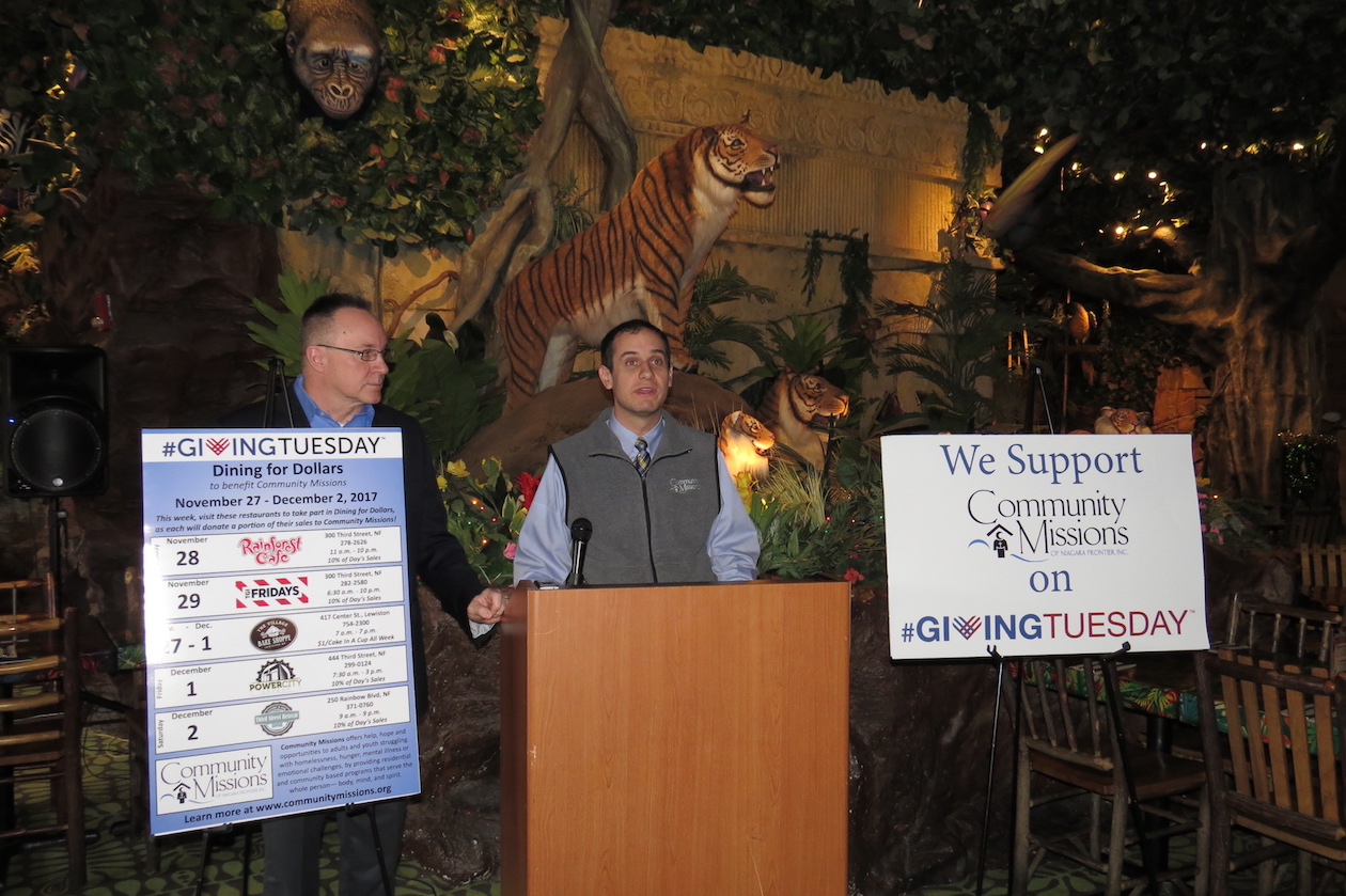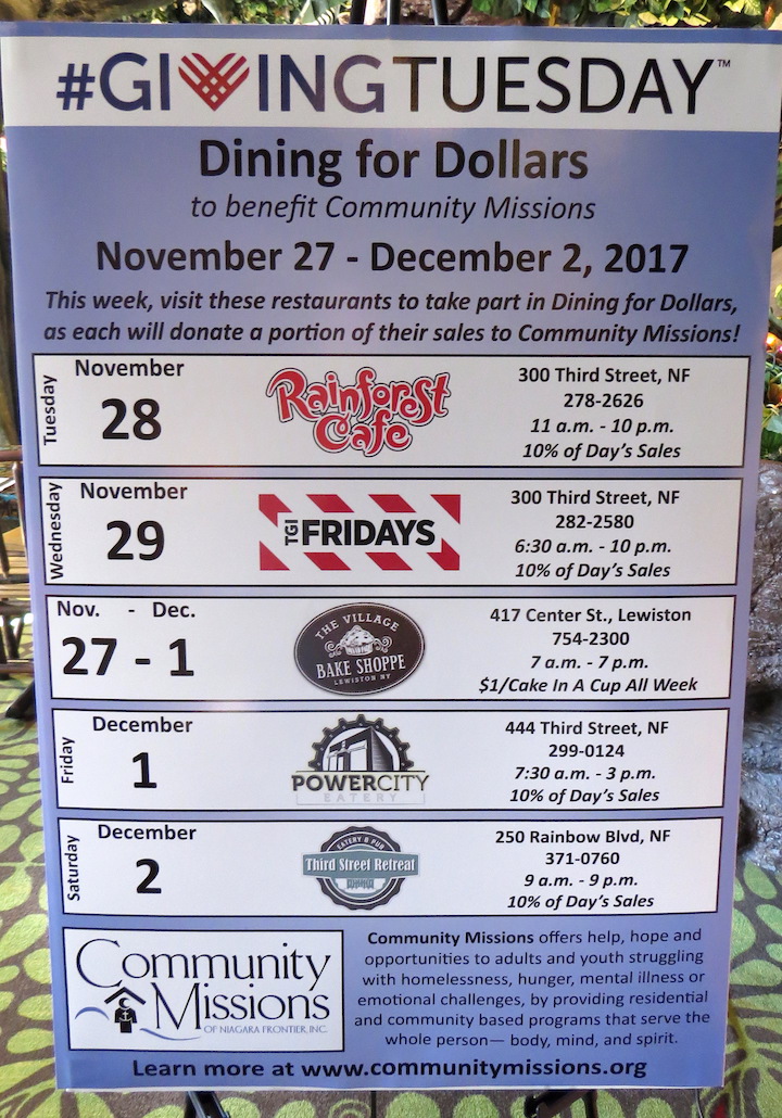 As part of the global Giving Tuesday initiative, local establishments have teamed with the agency to provide needed funds for the less fortunate. Rainforest Café will donate 10 percent of its sales to Community Missions on Tuesday, Nov. 28, while TGI Friday's will do the same on Wednesday, Nov. 29. On Friday, Dec. 1, Power City Eatery will donate in the same fashion, as will Third Street Retreat on Saturday, Dec. 2. Lewiston's Village Bake Shoppe will also donate $1 for each "Cake in a Cup" sold throughout the week.
