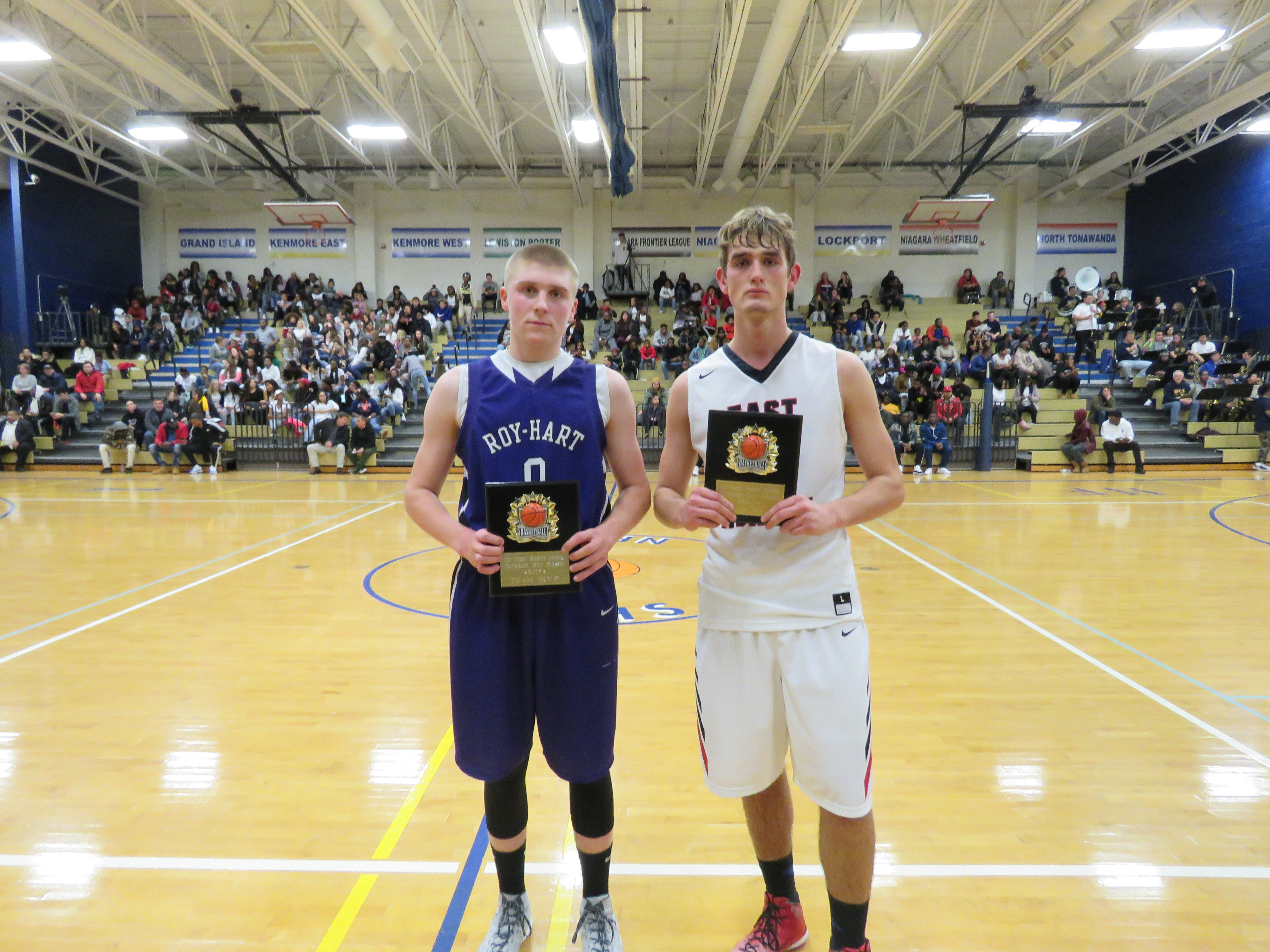 Left to right: Game MVPs Jacob Bruning of Royalton-Hartland and Bruno Tillman of East Aurora. (Photo by David Yarger)