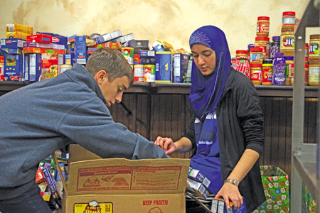 Mark Giancola and Anam Hussain sort food for later bagging and distribution to needy families. (Photo by Larry Austin)