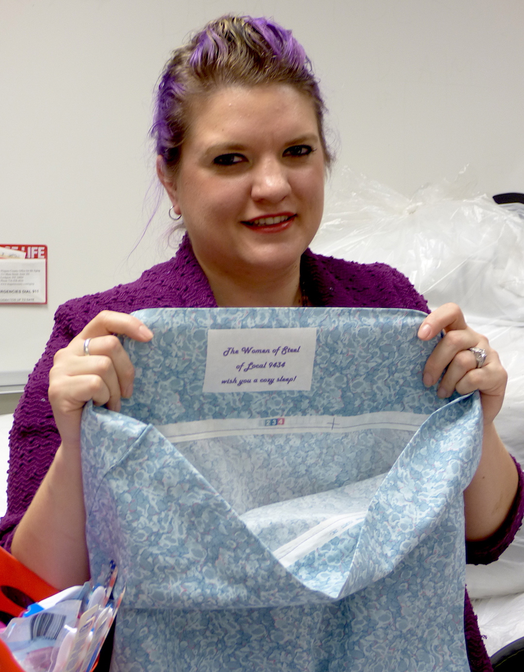 Brook D'Angelo with a handmade sheet that reads, "The Women of Steel of Local 9434 wish you a cozy sleep!"