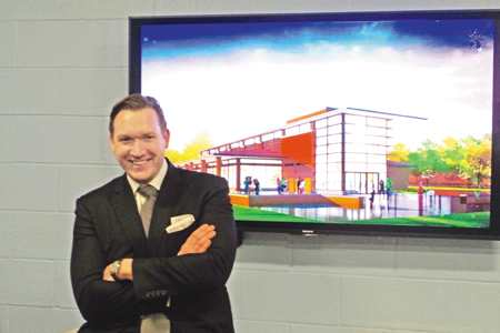 Grand Island Supervisor Nathan McMurray is shown in front of a diagram of the new welcome center to be located on Grand Island. (Photo by Alice Gerard)