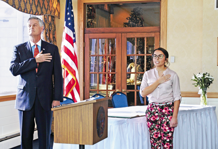 Master of Ceremonies Michael Rayhill stands with Natalie Baldassare, as she sings "The Star Spangled Banner" before the start of the swearing-in ceremony Jan. 1 at the Buffalo Launch Club.