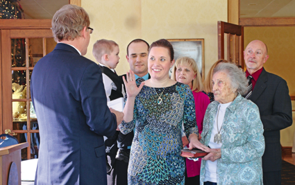 Town Justice Mark Frentzel, standing in for New York State Supreme Court Justice Russell Buscaglia, swears in Town Councilwoman Jennifer Baney.