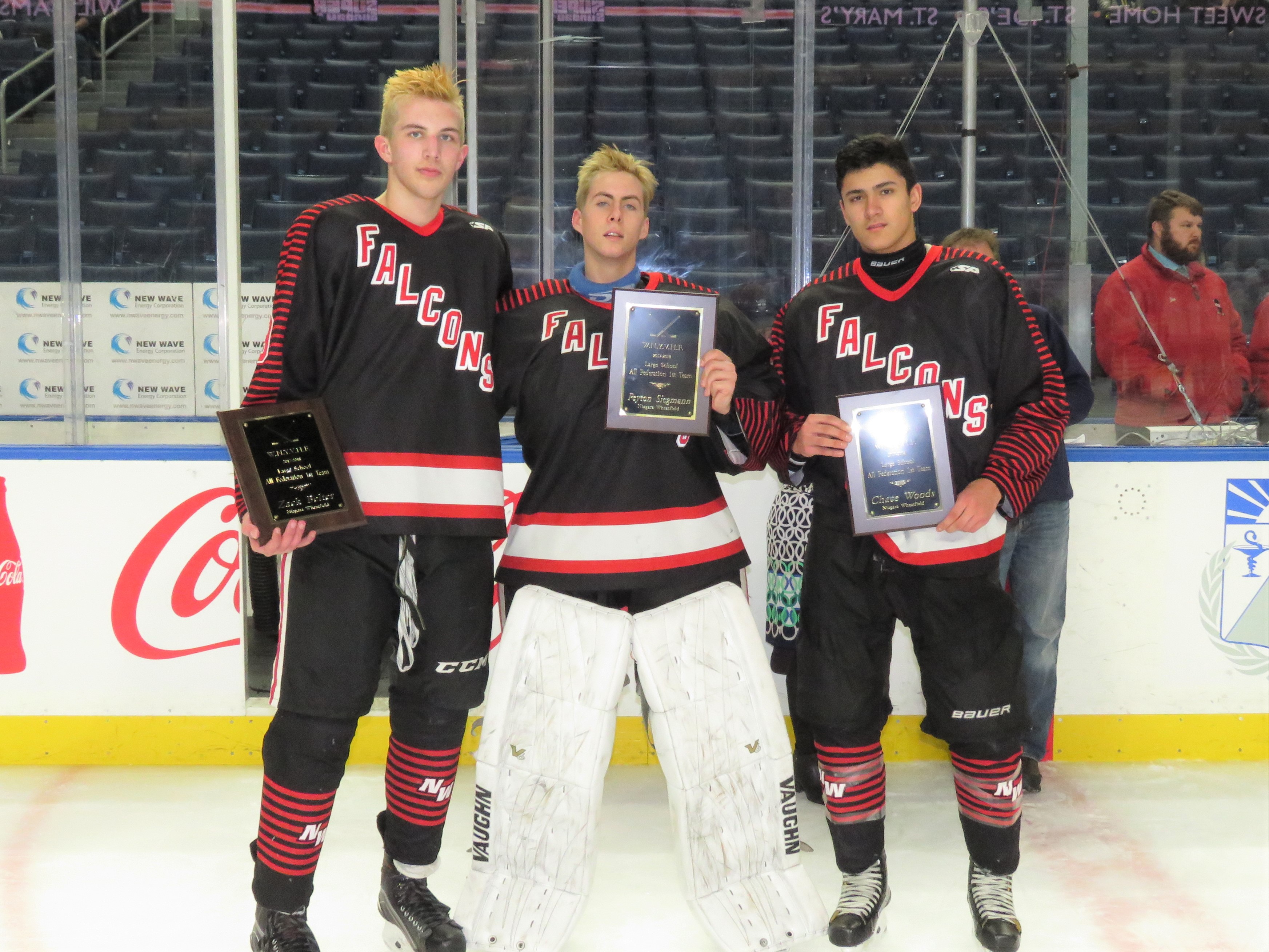 It's been four days shy of three years since the Niagara-Wheatfield Falcons hockey team raised their last Section VI championship. On Monday evening, the Falcons got back to the top, as they defeated unbeaten Williamsville North, 2-0, in the Section VI large schools title game.