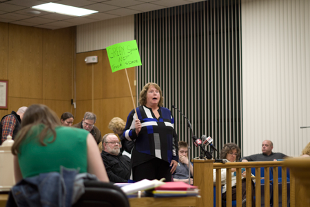 Nancy LaChiusa holds a sign than says "Green Space Not Truck Space" during a public hearing on a proposed local law banning travel plazas on Grand Island. (Photo by Larry Austin)