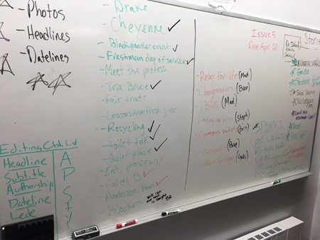 Jackson, with the help of Teresa and the school's administration, created a space where students can create and produce articles. Located in the basement of one of the dormitories on campus, The Wire's newsroom, once a storage area, is now filled with computers, tables and whiteboards for working and editing.