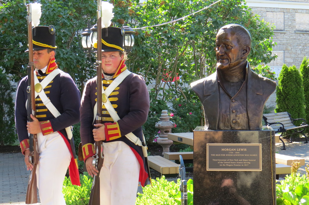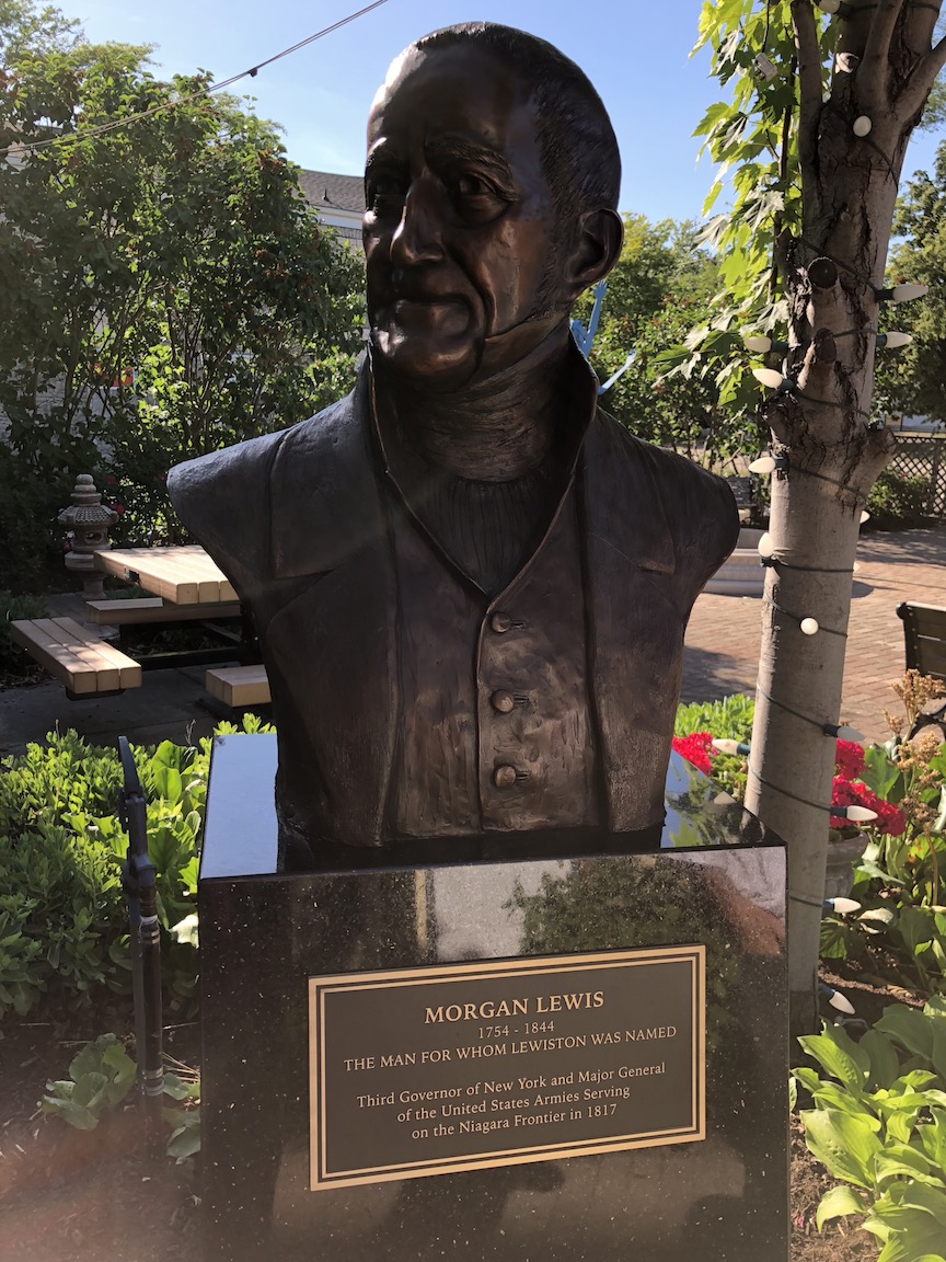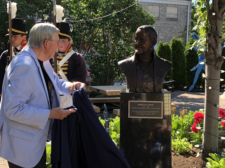 The man for whom Lewiston was named received his own monument on Thursday, as the Village of Lewiston officially unwrapped the Morgan Lewis bust inside the International Peace Garden. Acclaimed sculptor Susan Geissler created the artwork - her third monument in Lewiston, joining the Tuscarora Heroes (Center Street) and Freedom Crossing (Water Street).