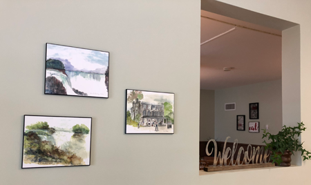 Stephen Pusateri stands in front of a painting donated to the Villa Coffee House by Roland Rosati. Mary Furlong also donated art to the restaurant (below).