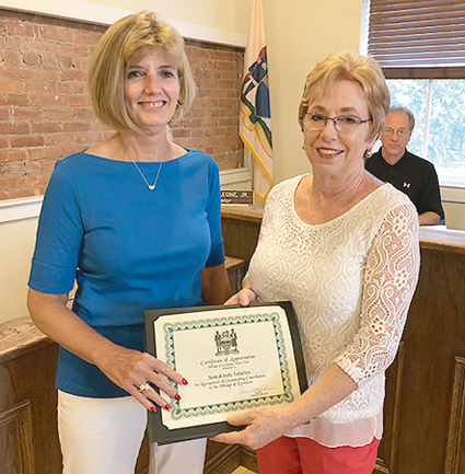 Some of the 52 Lewiston Garden Club members attended Monday's Village of Lewiston Board meeting to receive a proclamation from Mayor Anne Welch and the Village Board. Below: Beautification Commission members Pam Hauth and Marianne Gittermann, with Welch, also received an award, as did Judy Talarico.